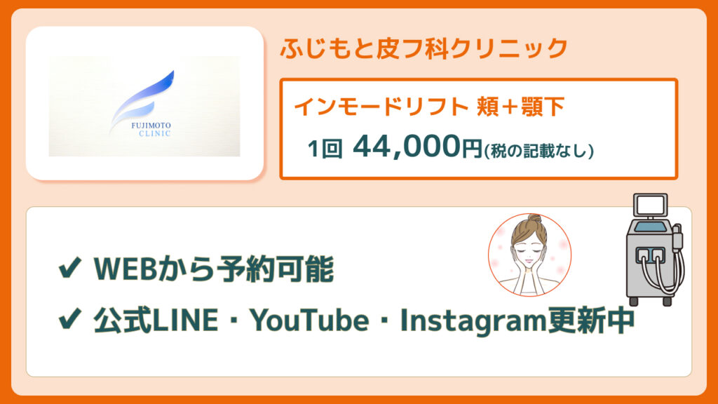 ![]() ふじもと皮フ科クリニック | インモードリフト頬+顎下 1回 44,000円 (税の記載なし) | 公式サイト |