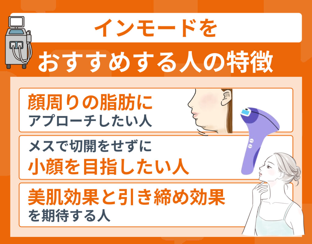 - 脂肪が原因で顔が大きく感じる方や、メスを使わずに小顔を目指いしたい方、美肌効果も期待したい方にはインモードがおすすめ
