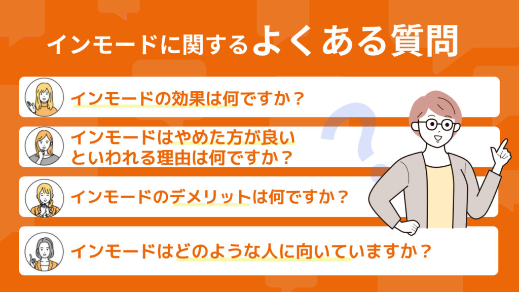 ここでは、インモードの効果やデメリット、どんな人に向いているのかなど、気になる質問に答えています。