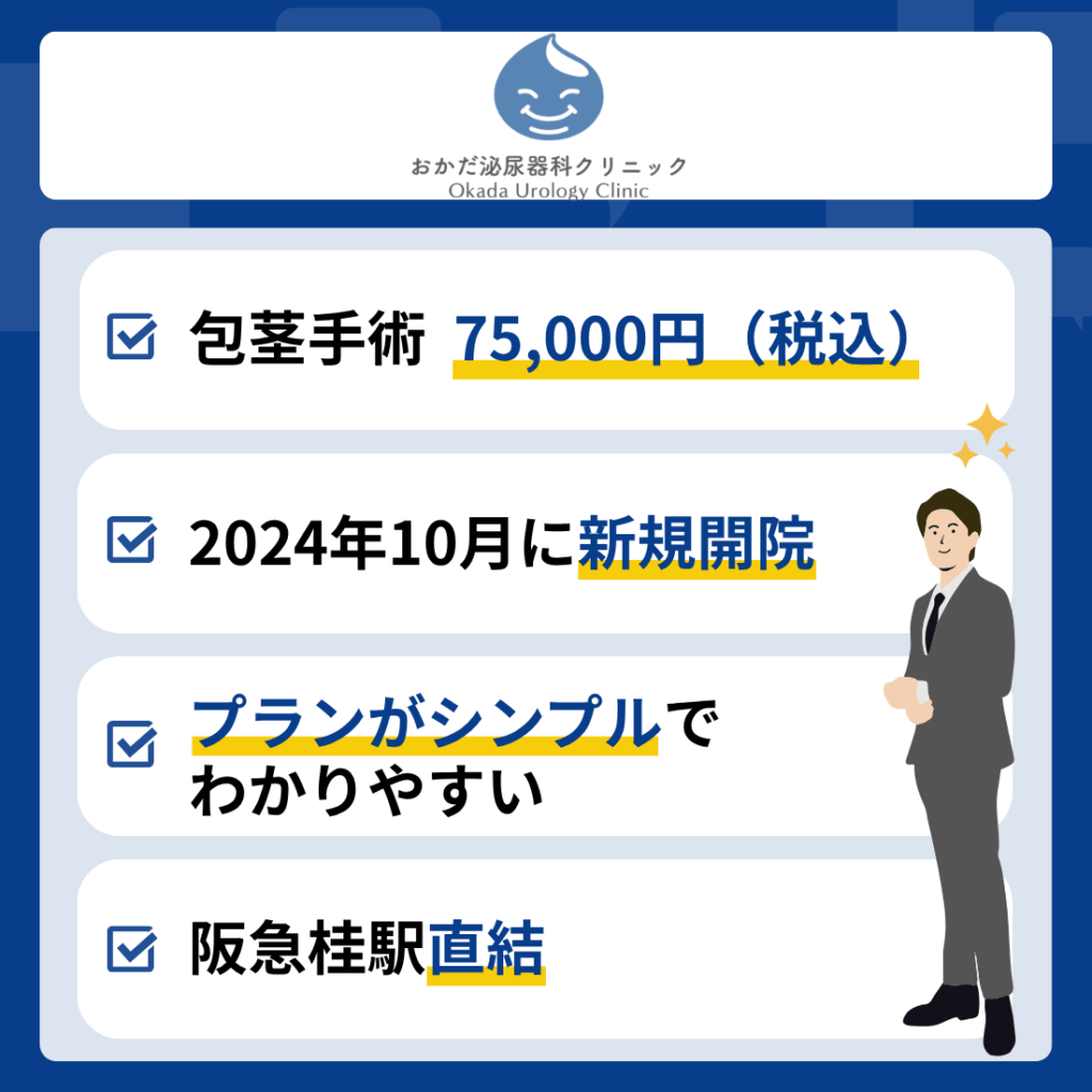 おかだ泌尿器科クリニックでは、包茎手術の料金プランがシンプルでわかりやすく提示されているため、初めて手術を検討する方でも費用の目安を立てやすい点が特徴です。
