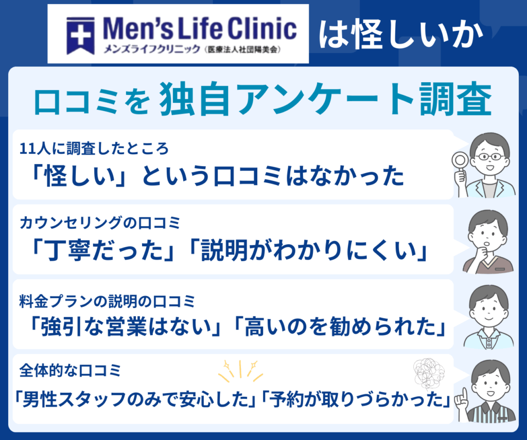 メンズライフクリニックの口コミ評判について、独自アンケート調査を行ったところ、「怪しい」といった口コミはありませんでした。