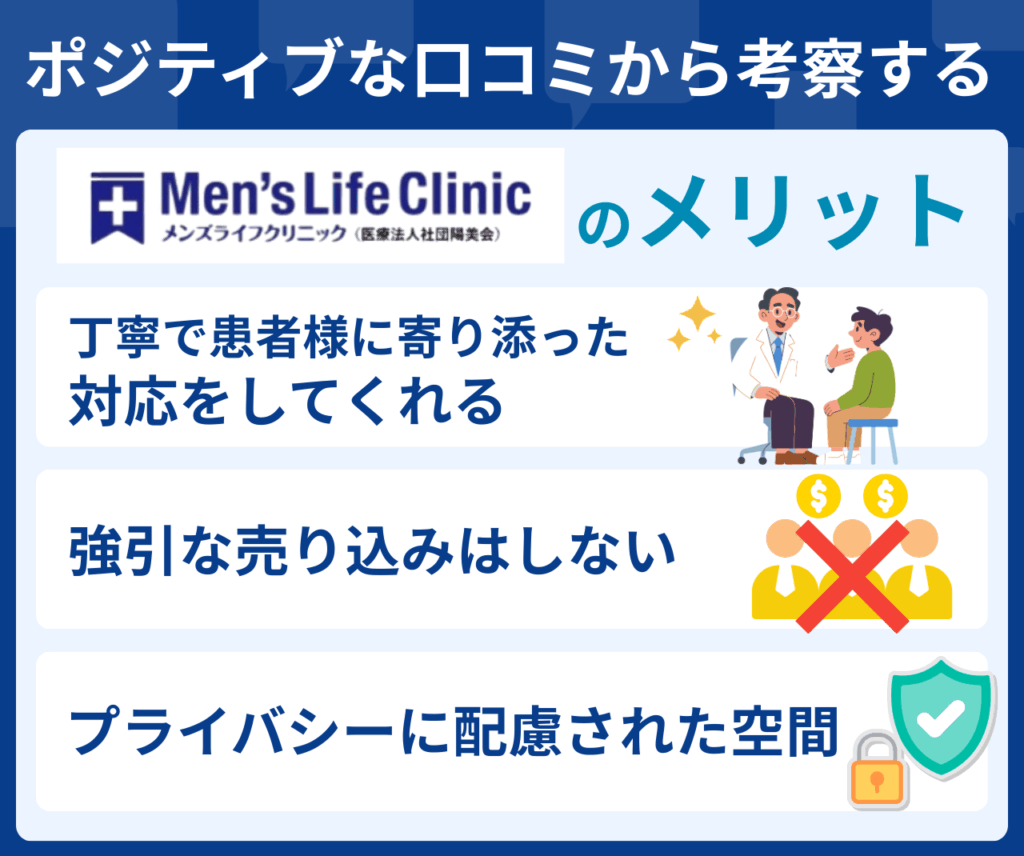 男性特有のデリケートな悩みだからこそ、対応の丁寧さが評価されている印象です。