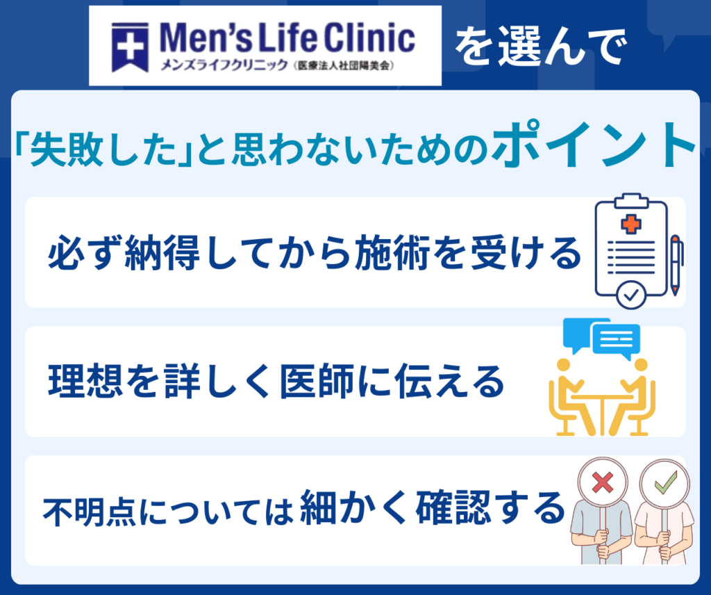 メンズライフクリニックは、自然な仕上がりや美容性を重視する人、プライバシーを徹底的に守りたい人におすすめのクリニックといえます。