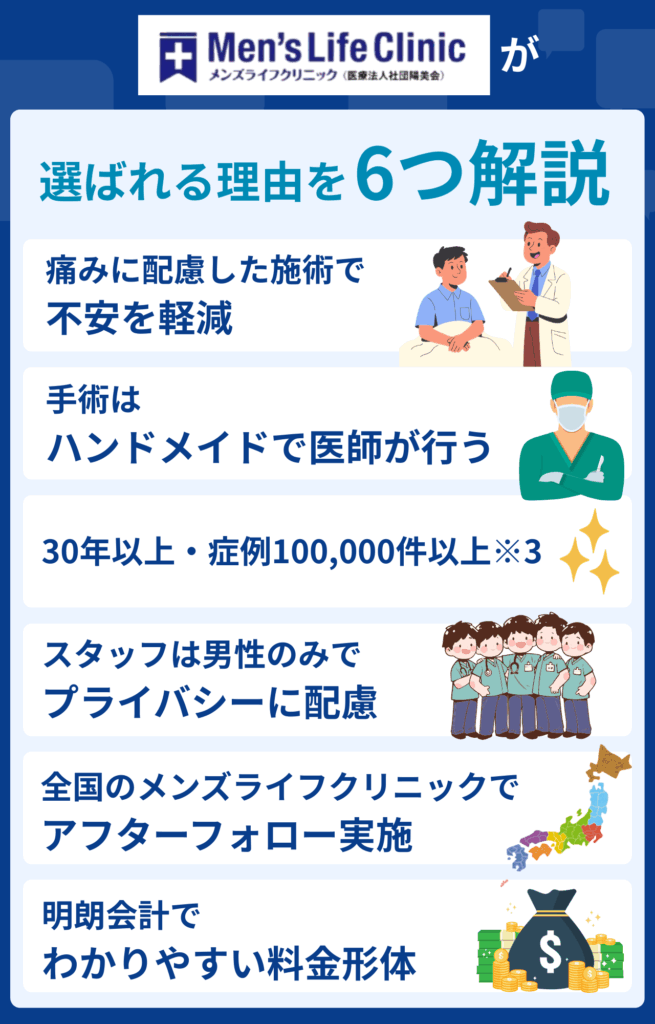 メンズライフクリニックが選ばれる理由は、痛みに配慮している点や徹底したプライバシーへの配慮、医師がオールハンドメイドの手術を行っている点です。