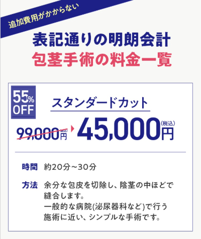 特に料金の面では、スタンダードカット(環状切除術)を通常99,000円(税込)のところ、55%OFFの45,000円(税込)※1で受けられます。