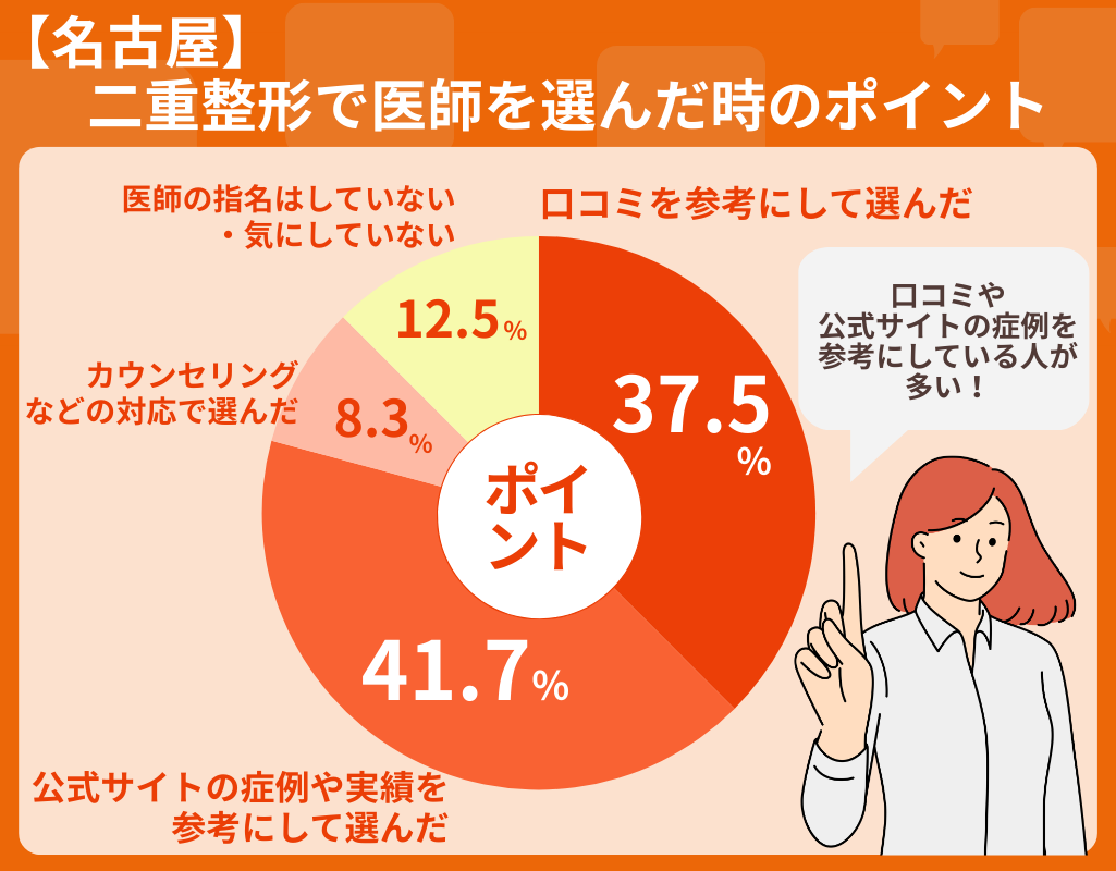 また、実際に名古屋エリアで二重整形を受けたことがある方に、医師を選んだ時のポイントを伺いました。