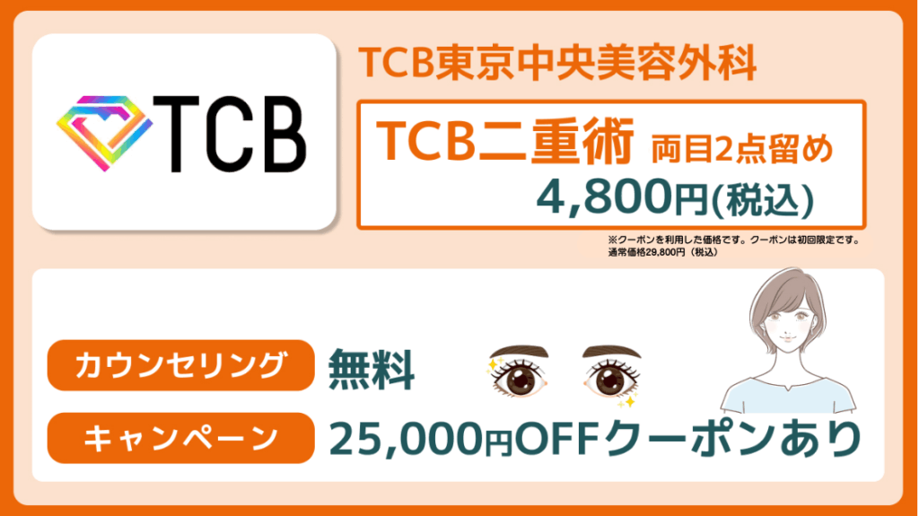 大阪で二重整形を受けるなら、25,000円OFFクーポンを利用できるTCB東京中央美容外科がおすすめです。