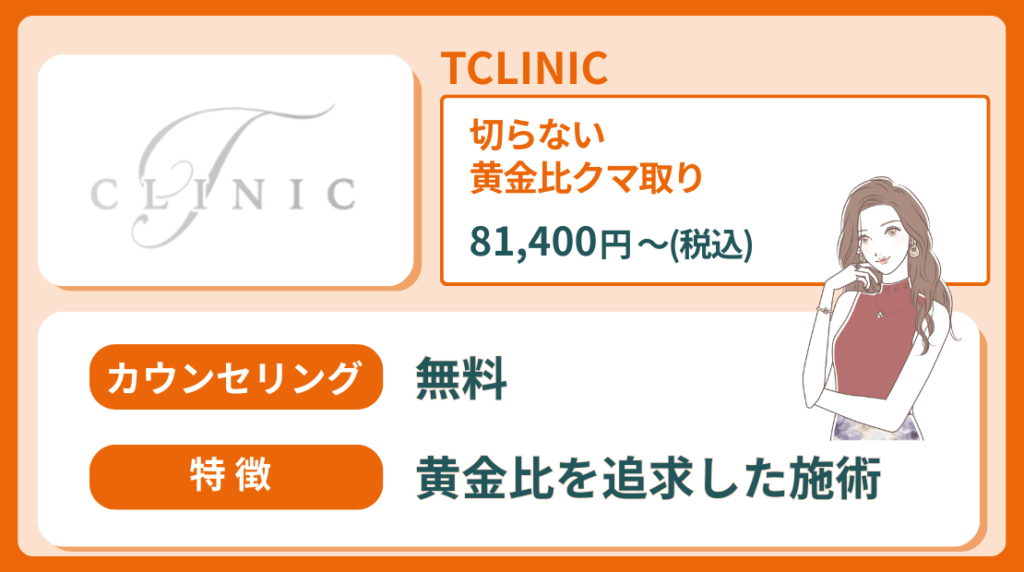 今回紹介するクリニックは、低価格で利用しやすいTCB東京中央美容外科、20,000円OFFチケットを配布している湘南美容クリニック、切らない黄金比のクマ取りを提供しているTCLINIC、LINEでお得なクーポンを貰える品川美容外科、ワンドクター制で担当医が最後まで対応してくれる共立美容外科です。