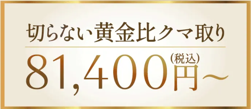 東京の美容クリニックごとにクマ取り施術の料金は異なりますが、脱脂のみなら100,000円〜300,000円程、脂肪注入込みの場合は200,000〜400,000円前後が相場かなというイメージです。